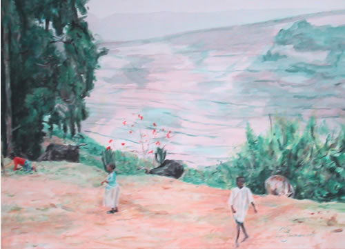 This series of paintings was inspred by Kim's recent visit to Uganda where she stayed in a village near Kibale. Kibale is located in the South West corner of Uganda. All paintings are oil on canvas and are about 700mm x 450mm. The collection is framed and for sale at a price of £1,250 each.